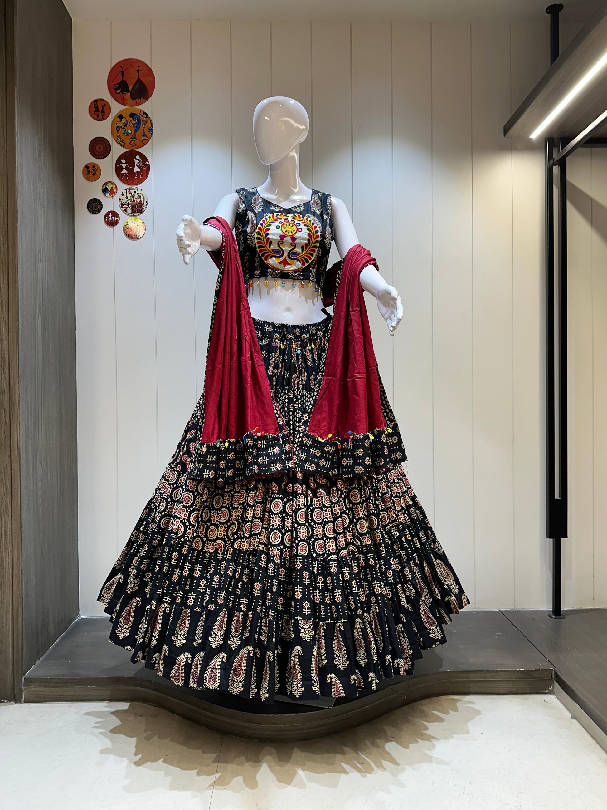 👉Camric chikko and red colour cotton printed chaniua choli 💃